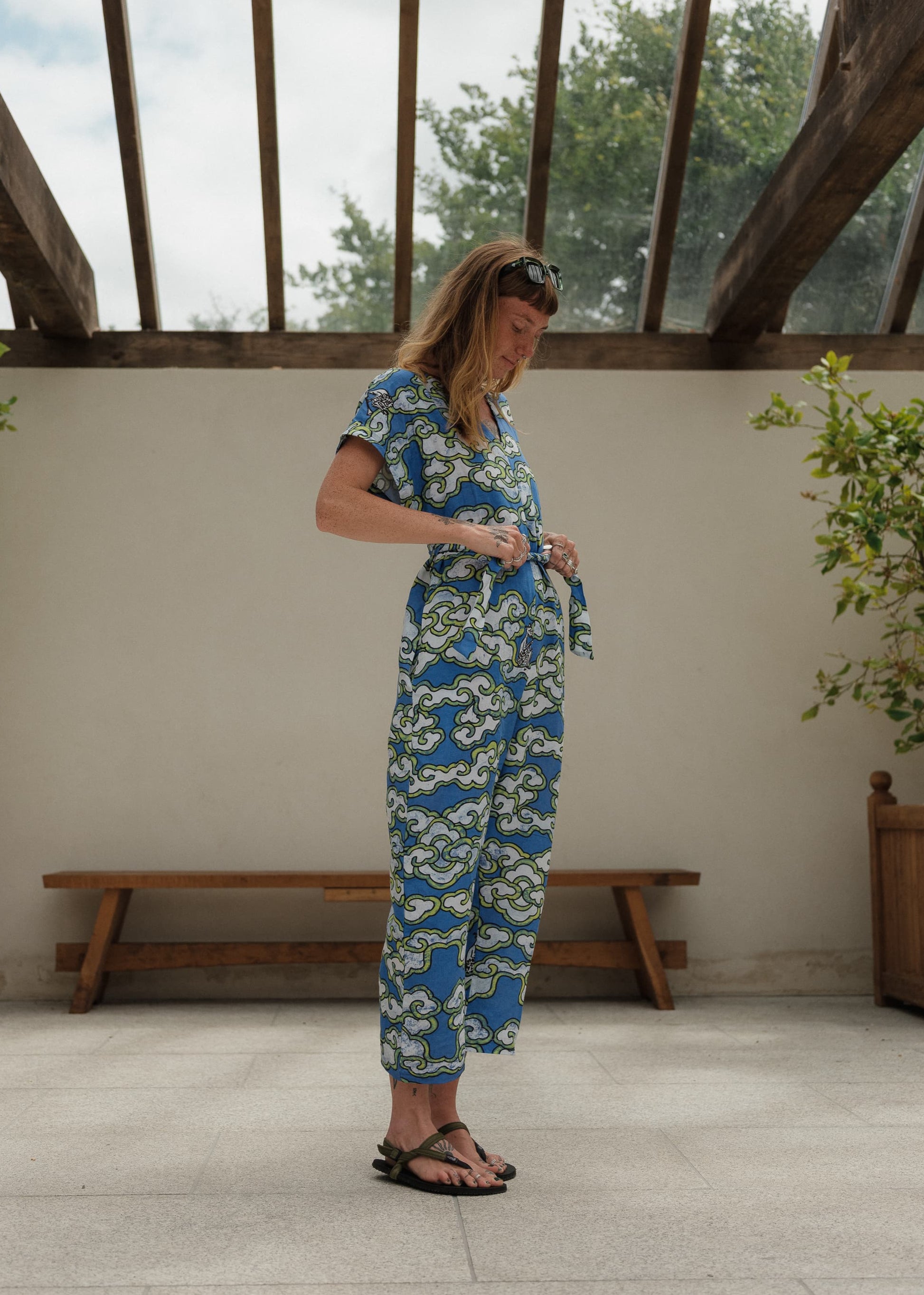 Embrace effortless style with this loose-fit jumpsuit featuring a tie waist for a flattering silhouette and pockets. Showcasing our beloved green clouds print transformed into hand-painted blue clouds with vibrant pops of luminous green, it’s a fresh twist on a classic. Crafted in the UK from a luxurious blend of linen and EcoVera, this jumpsuit feels as good as it looks. Perfect for those who love comfort, colour, and conscious fashion all in one.