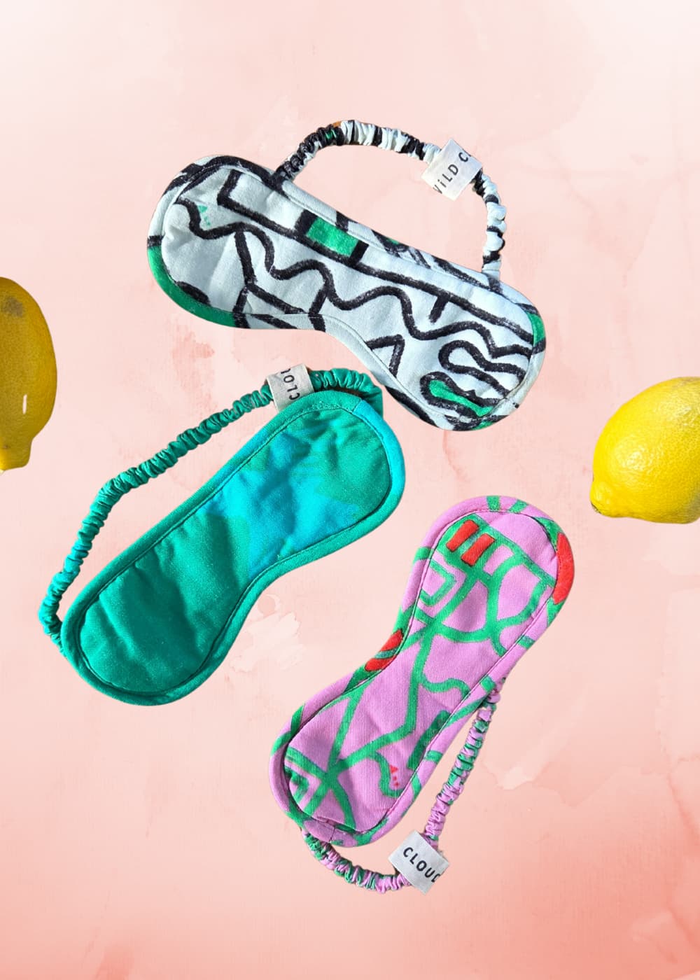 Wild Clouds Eye Masks, made from our soft organic cotton and linen offcuts. Perfect for festivals and holidays!